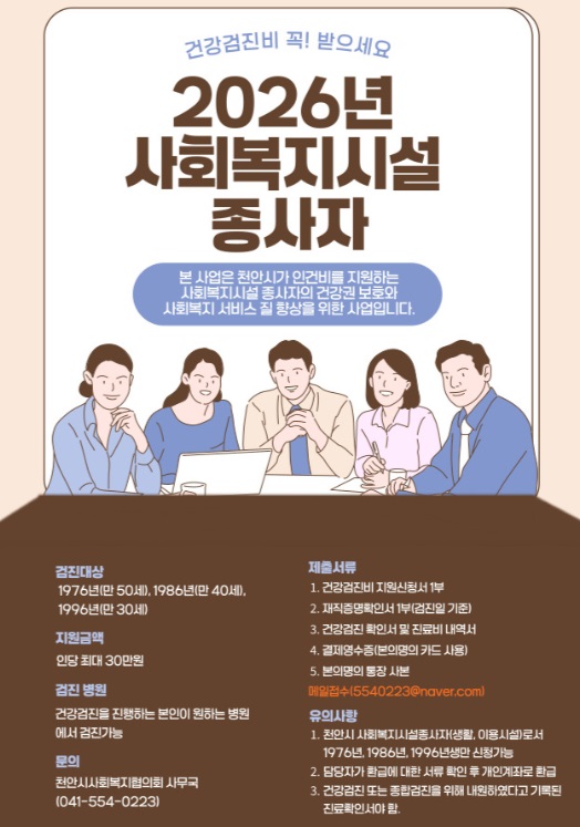 2026년 사회복지시설종사자 건강검진비 지원사업 안내 페이지 정보 작성자작성자 : 천사협 조회조회수 : 591회 작성일작성일 : 26-03-03 15:54 본문 2026년 사회복지시설종사자 건강검진비 지원사업 안내드립니다. 첨부파일 건강검진비 지원 신청서2026년 최신본.hwp (20.5K) 27회 다운로드 목록 이전글-사회복지시설 종사자 처우개선을 위한 '시립예술단 연계 문화·예술공연 관람' 지원 계획 26.03.16 다음글2026년 예산서 공고 25.12.31